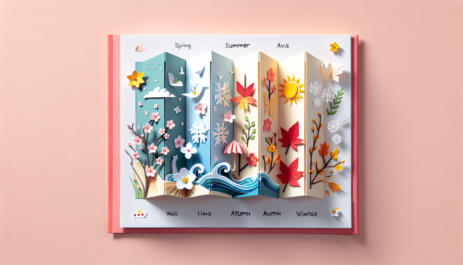蛇腹折りの折り目を利用して、季節ごとの景色や風物詩を区切って配置することもできます。これにより、一枚のお便りの中で四季の移り変わりを順序立てて表現することが可能になります。例えば、春夏秋冬の代表的な景色を順に配置し、折りを開くごとに季節が変化していく様子を演出できます。